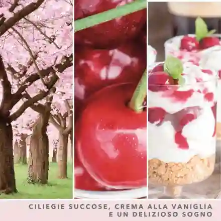Una ciotola di ciliegie! Profumi ispirati ai amponi e alle mandorle, ricoperti da soffici nuvole rosa pastello che evocano la panna alla vaniglia.