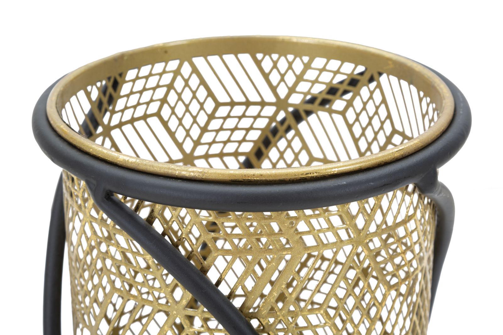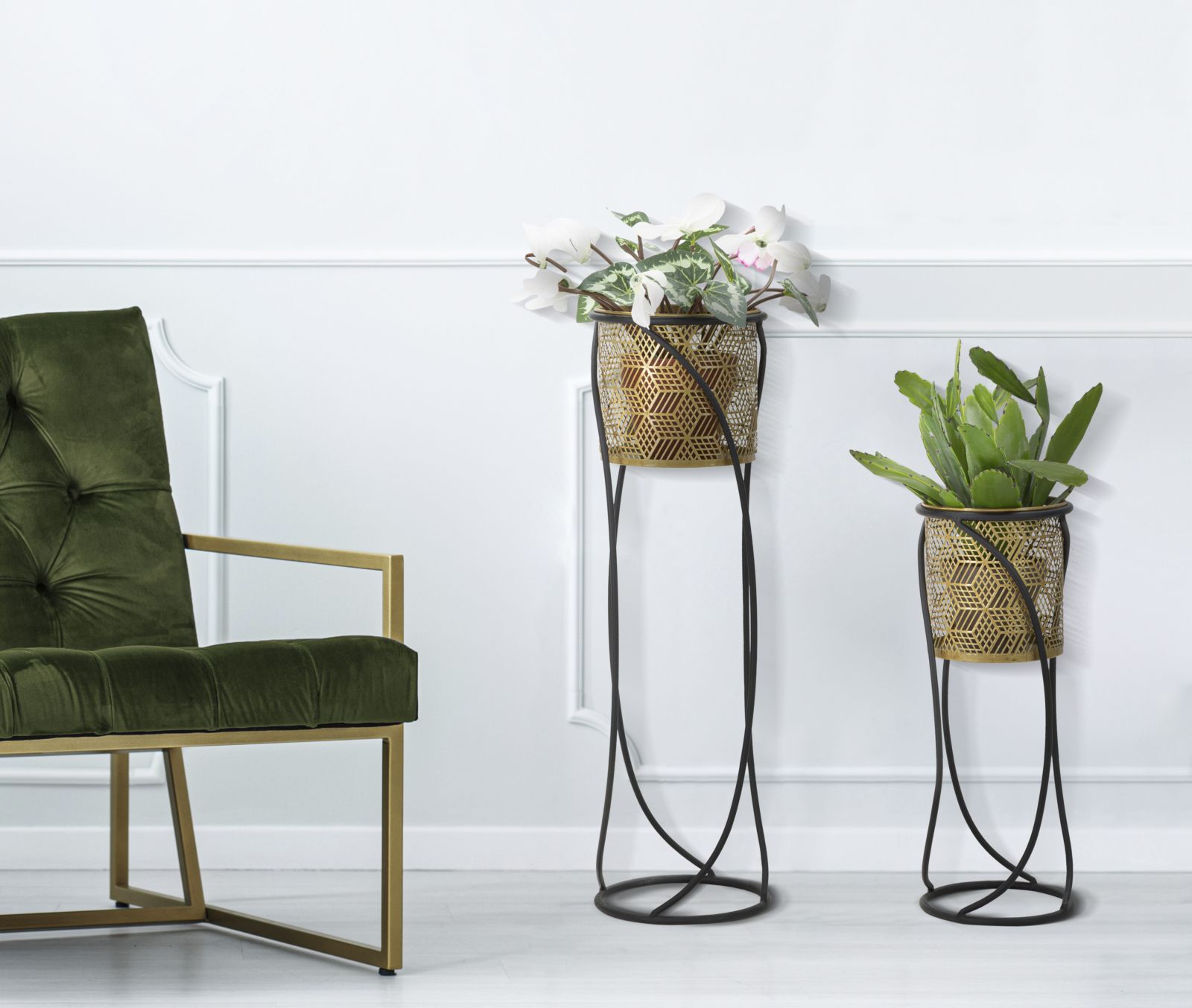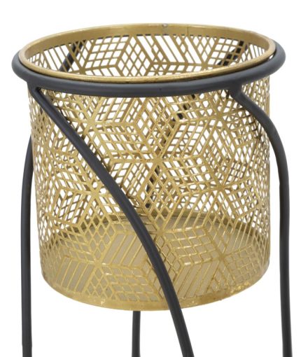 Coppia di portavasi in metallo dorato finemente intagliato con piedistalli in metallo nero. Le linee morbide e sinuose donano un tocco di armonia ad ogni ambiente.