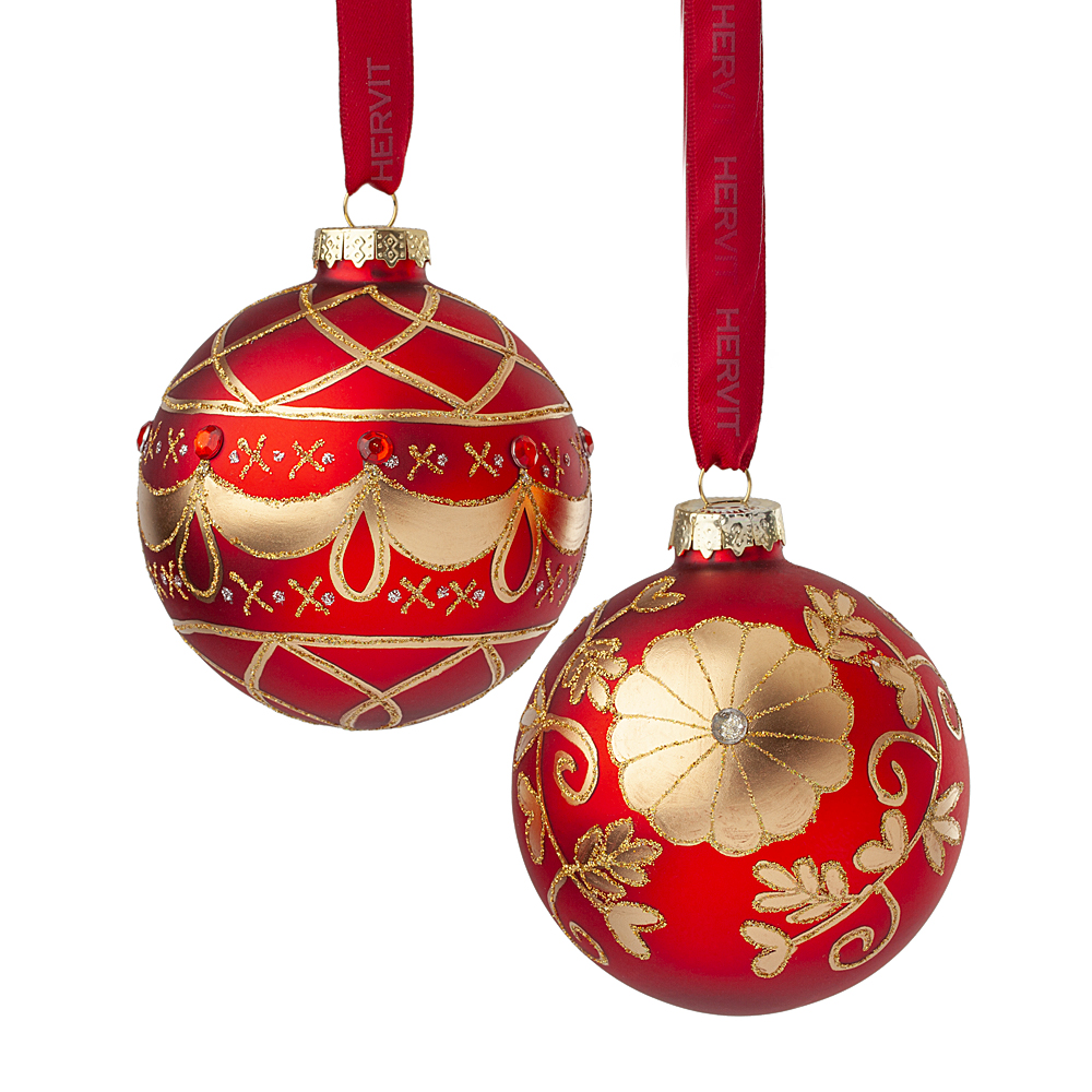 Box di 2 sfere in vetro soffiato assortite colore oro e rosso  e decorate con oro e glitter a mano.