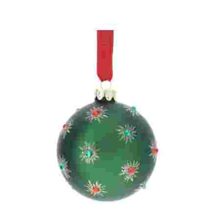 Bellissima sfera natalizie, realizzata interamente in vetro soffiato ,di colore champagne, con meravigliosi decori verdi e oro.