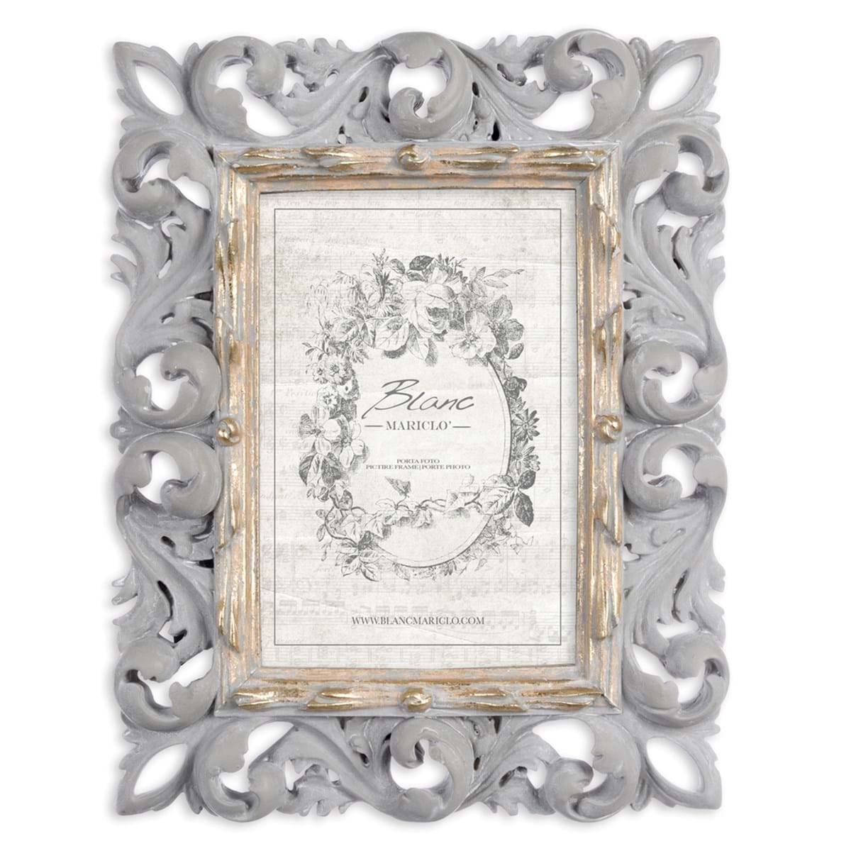 Porta foto con intagli e decori con effetto decapato colore grigio e oro, realizzato da Blanc Mariclò