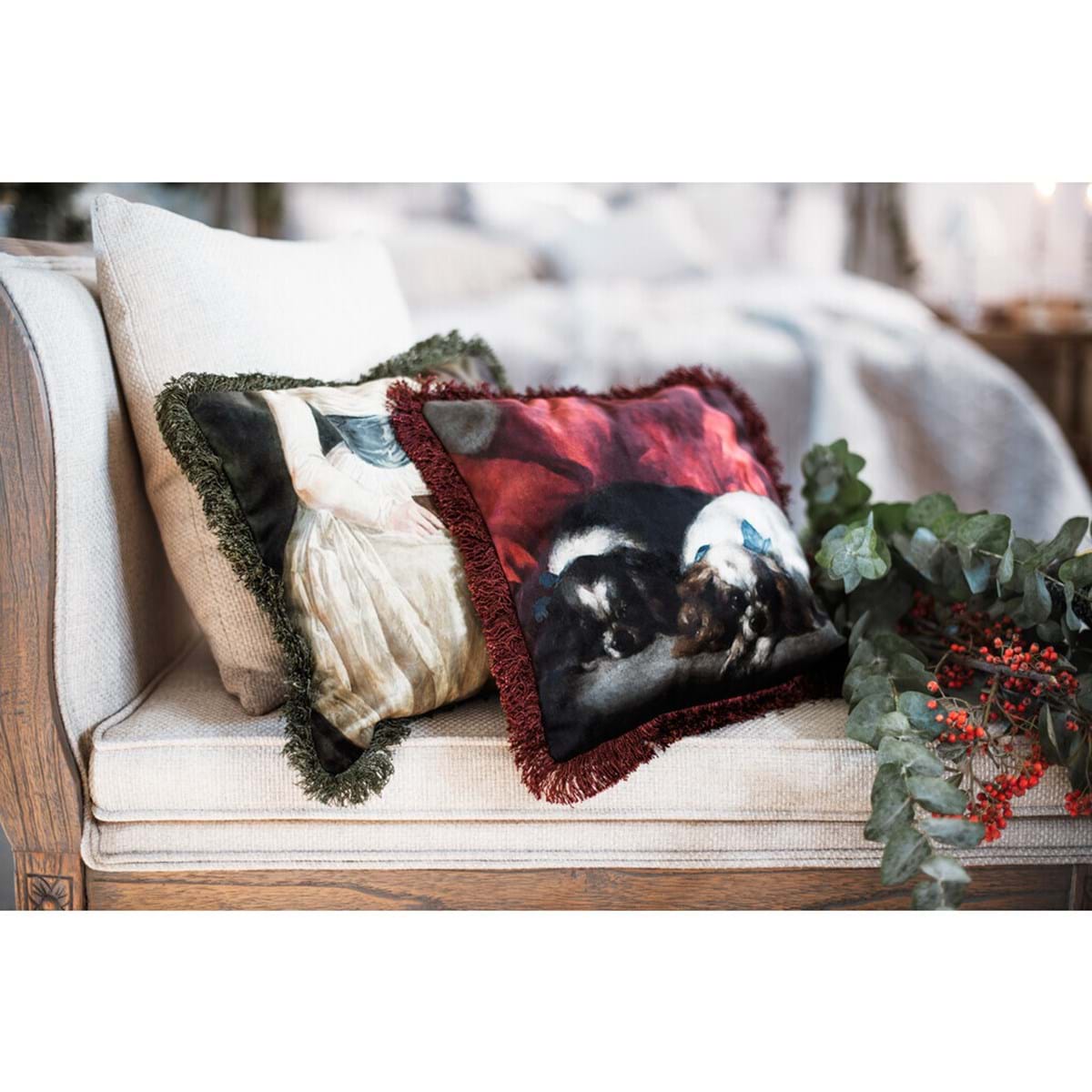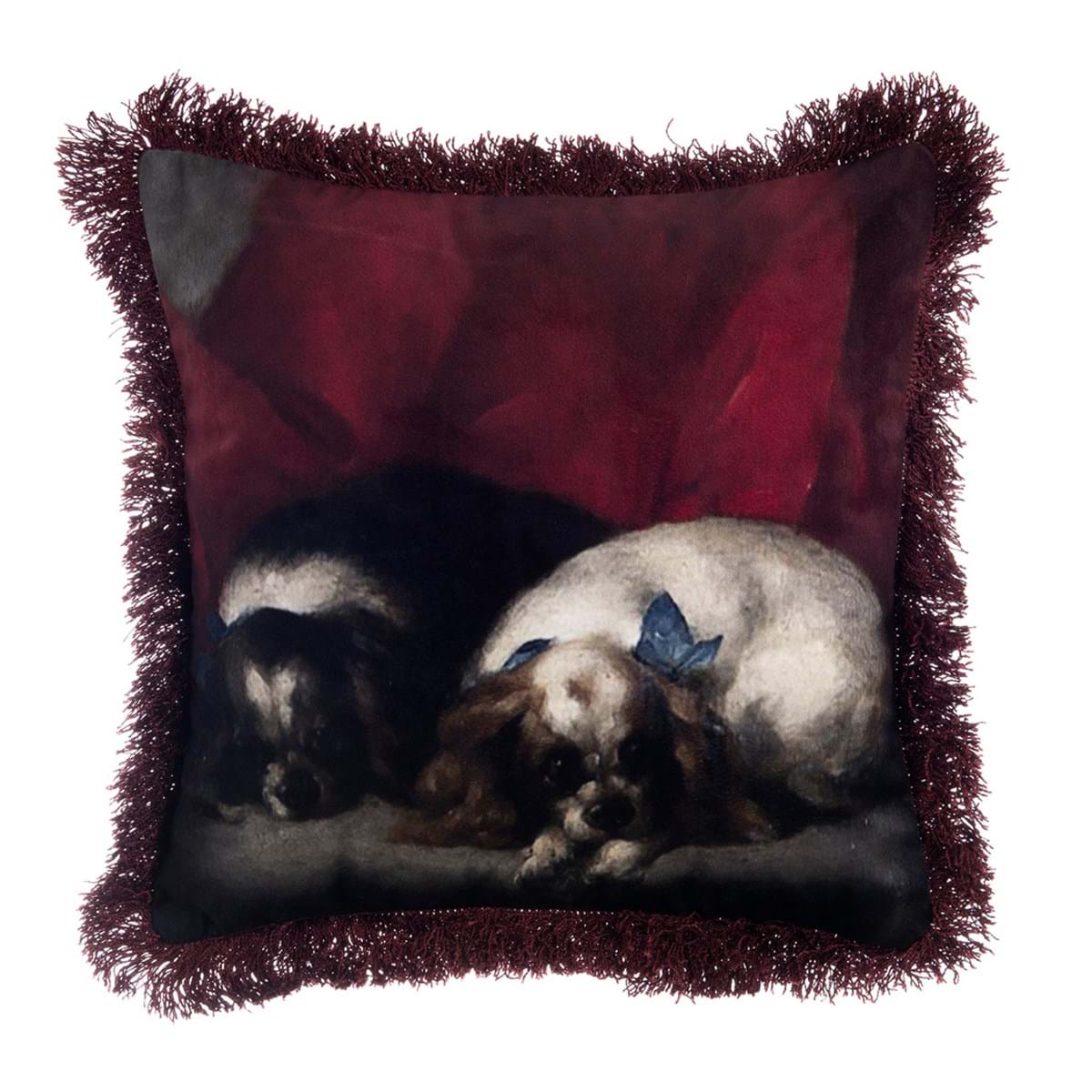 Grazioso cuscino in velluto firmato Blanc Mariclo’, realizzato con la stampa di due cagnolini che ricordano un quadro dipinto
